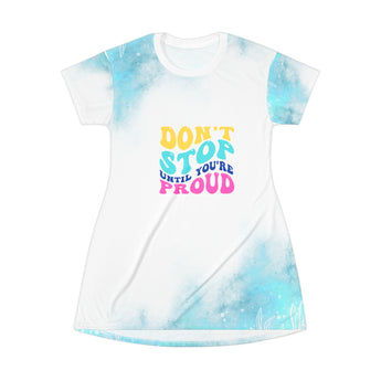 The "Don't Stop Til You're Proud" print is a powerful reminder to never give up on your dreams and to always be true to yourself. Wear this dress with confidence and let the world know you're not afraid to stand out.